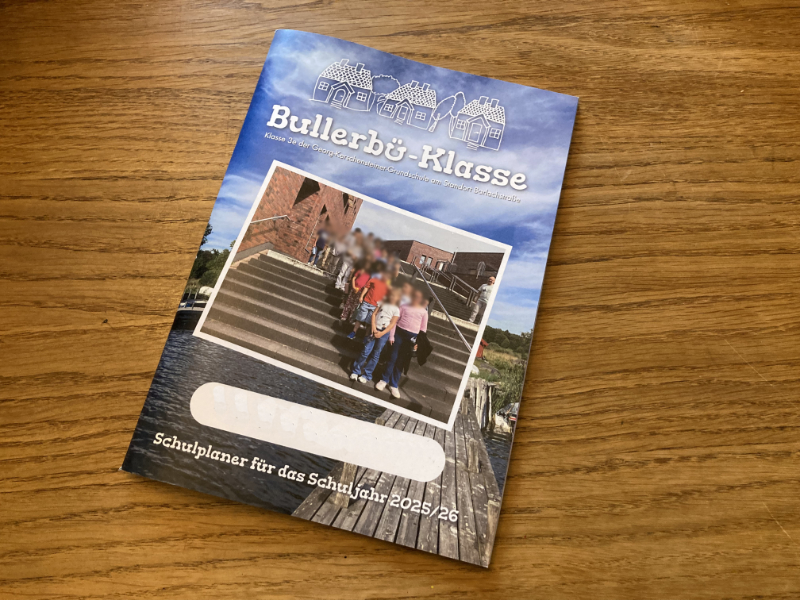 Im letzten Jahr noch als Schwarz-Weiss-Kopie am Schulkopierer selbst gefertigt, erstrahlt der diesjährige Schulplaner komplett in Farbe. Neben der Timerfunktion und einer Kalenderübersicht finden sich auch Bilder unserer Unternehmungen in dem 92-seitigen Heft. Da sich noch ein kleines Budget in der Klassenkasse befand, kommen glücklicherweise keine Kosten auf die Eltern zu.